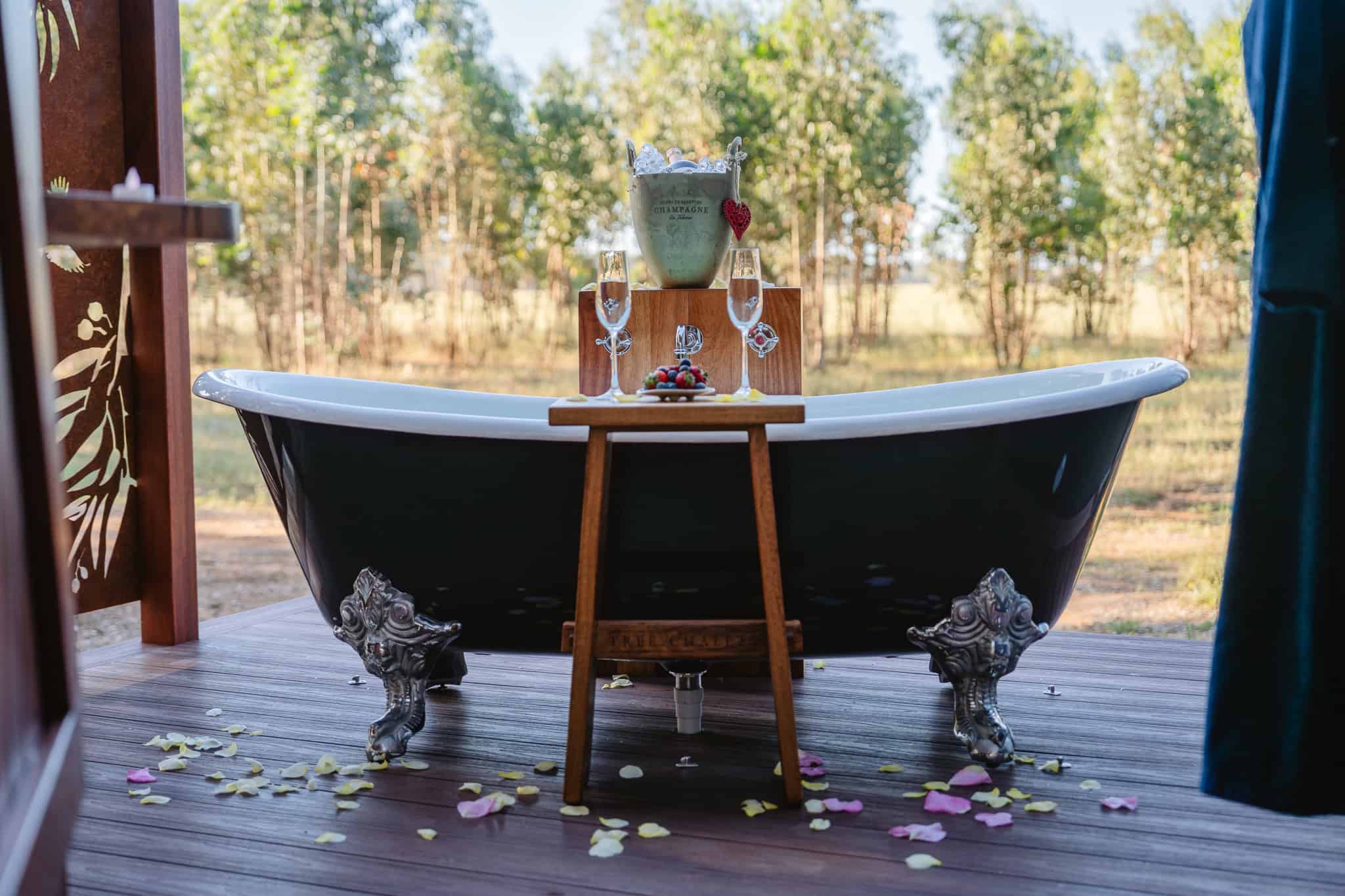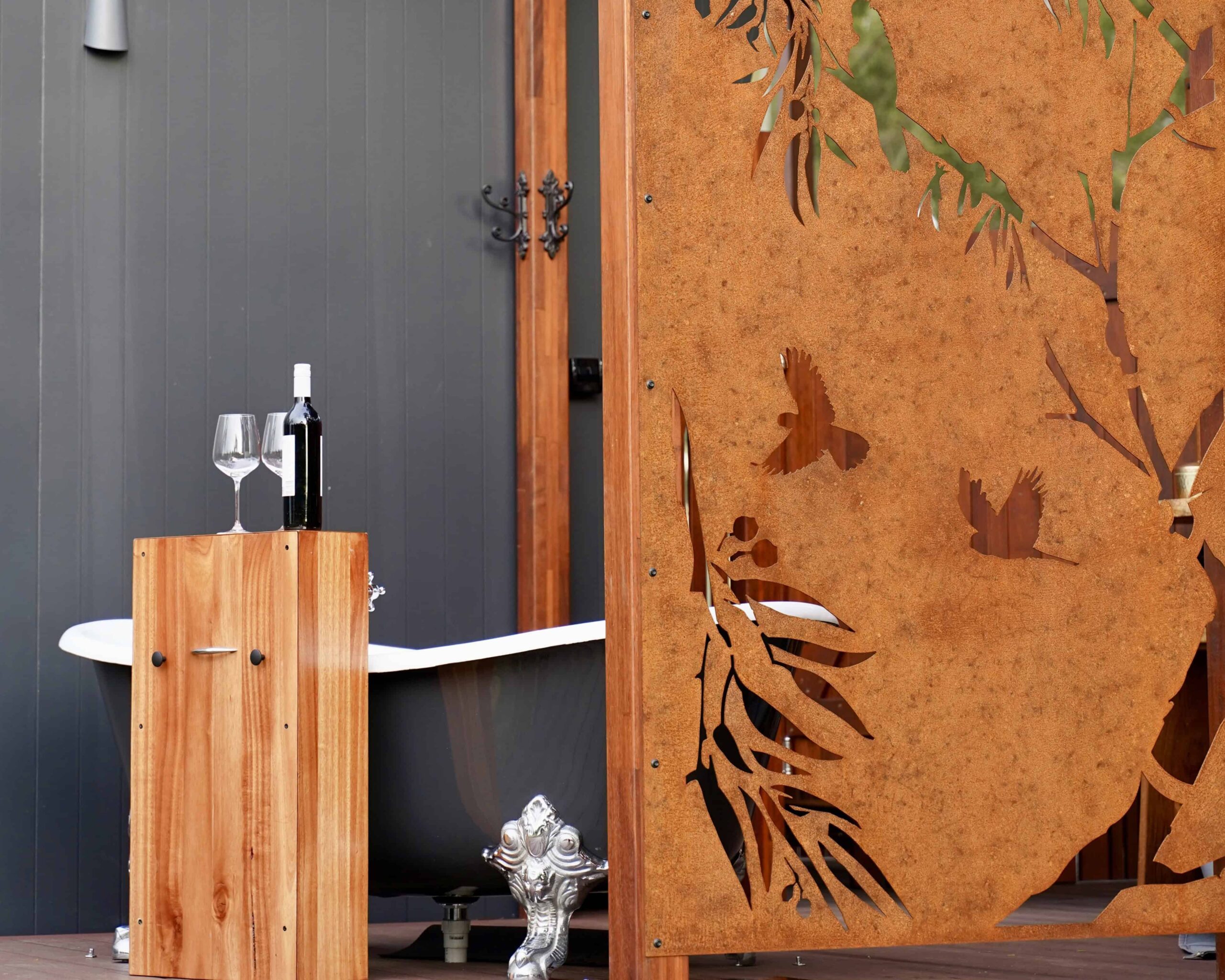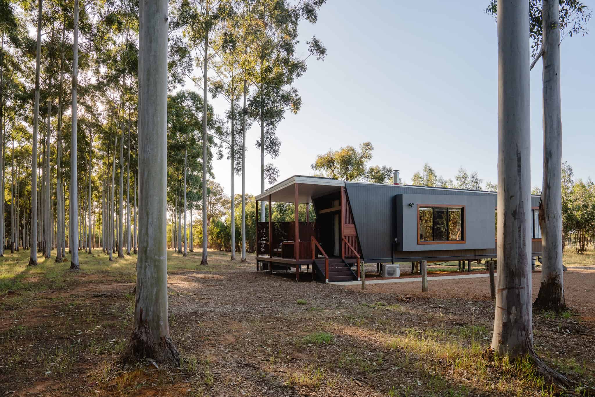 Grandis, our premium chalet, is set 450 metres into the property and is the only chalet located on the northern side of the plantation offering exclusive access to this area. Enjoy tree and farmland views from the secluded bath deck, while the front deck showcases the striking white trunks of the Rosegums (Eucalyptus Grandis).